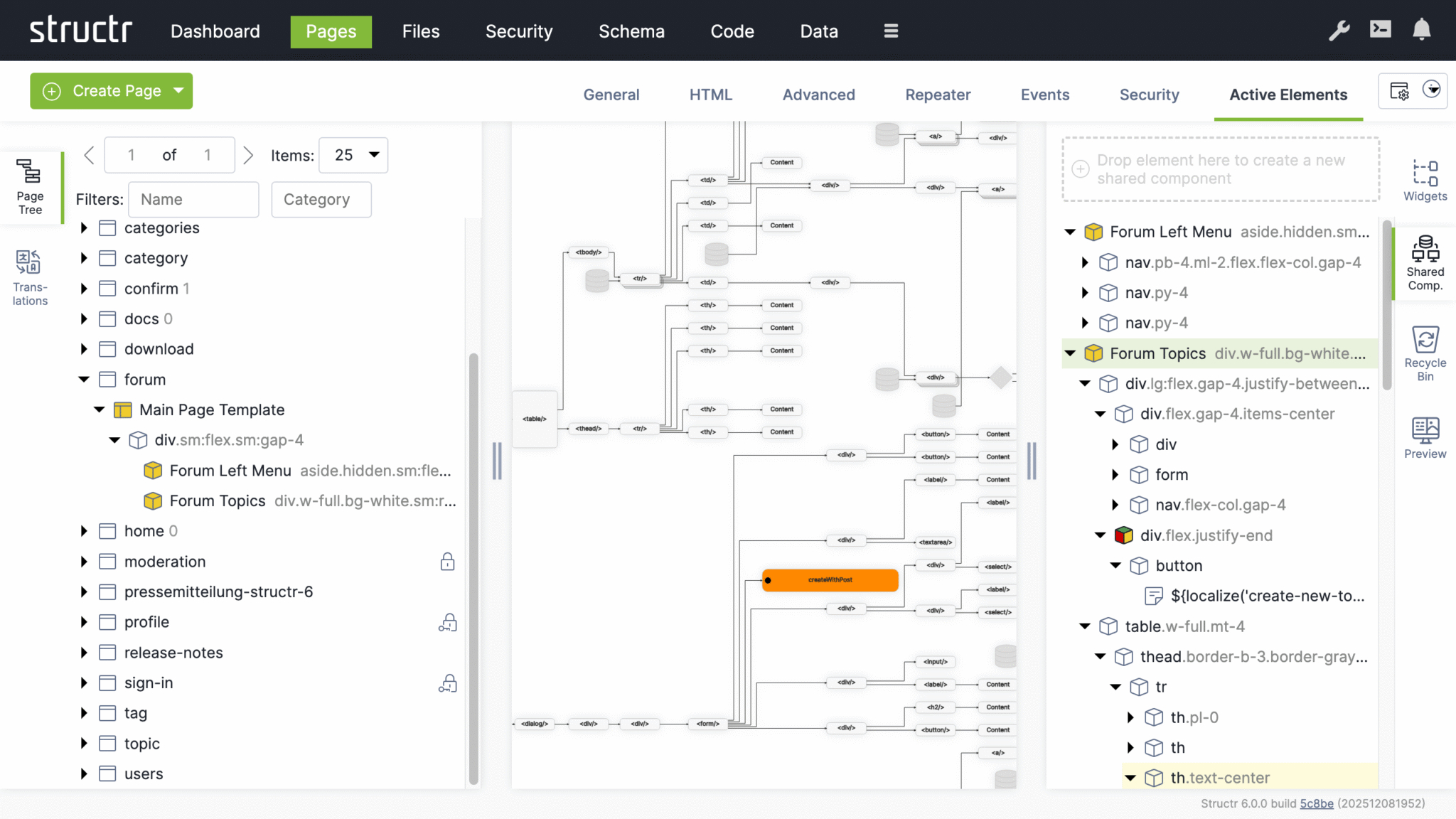 The Active Elements tab provides a structural overview of the page. Key page components are highlighted, such as templates, repeaters and elements with event action mappings. Clicking a component jumps directly to its location in the page tree.